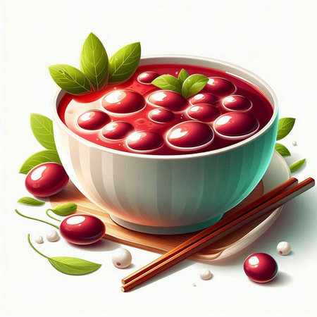Bowl of cherry soup with wooden chopsticks. Vector illustration.