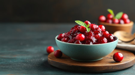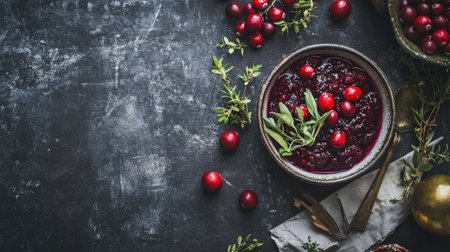 A beautifully arranged bowl of fresh cranberry sauce surrounded by seasonal berries and aromatic herbs on a dark textured surface, ideal for holiday meals.