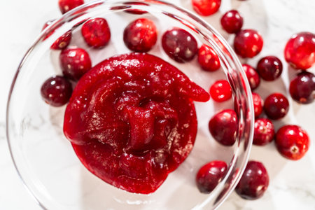 A glass bowl filled with smooth cranberry puree, surrounded by fresh cranberries on a marble countertop. The deep red color and glossy texture highlight the vibrant, tart flavor of cranberries. This image is perfect for illustrating homemade cranberry sauce, baking ingredients, or festive holiday recipes.