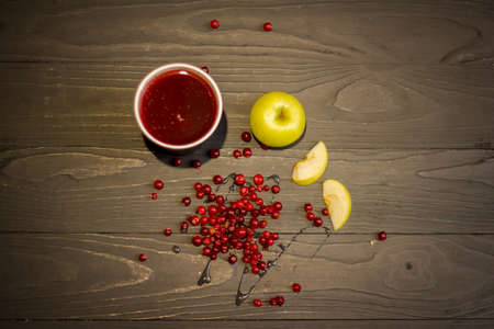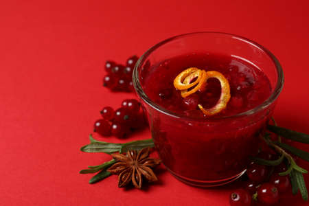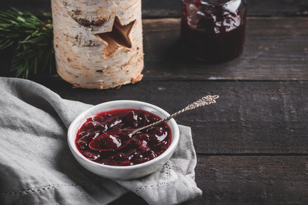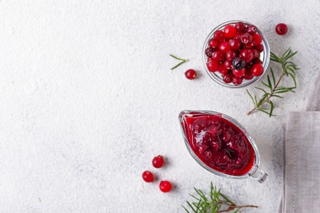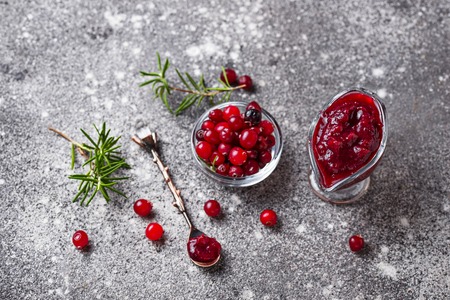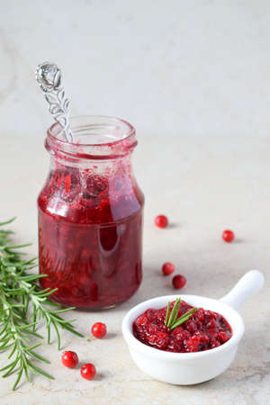 Cowberry sauce with rosemary and coconut sugar. Cranberry confiture. Spicy berry jam to meat, turkey. Autoimmune Paleo. Diet healthy food concept. Cereals Gluten Dairy free. Copy space