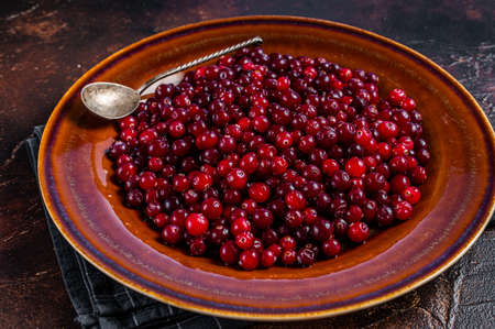 Ripe Red Cranberry berry in a rustic plate. Dark background. Top view