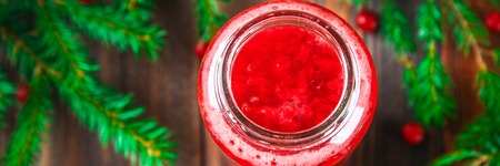Homemade raspberry jam in a glass jar on the background of the Christmas tree