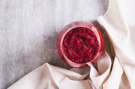 Homemade Lingonberry cranberry cowberries sauce. Fresh berries Lingonberry cranberries cowberries in ceramic cup. Lingonberry on table. Grey rustic wooden background. Top view