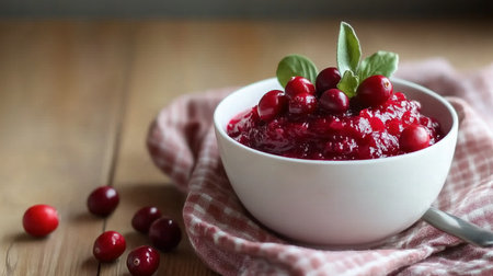 Freshly made cranberry sauce served in a bowl on a wooden table with cranberry garnish and a soft cloth backdrop