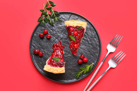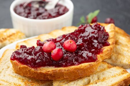 Cranberries jam. Crispy sandwich with cranberry sauce on dark background.