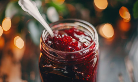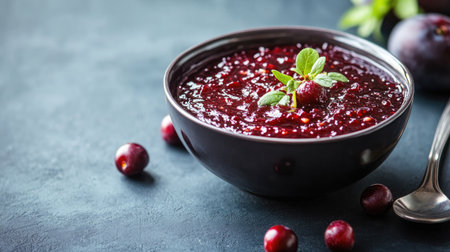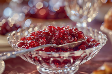 A beautifully presented bowl of rich, red fruit preserve sits on a table, sparkling in the light, inviting guests to enjoy its sweet, tangy flavor during a celebration.