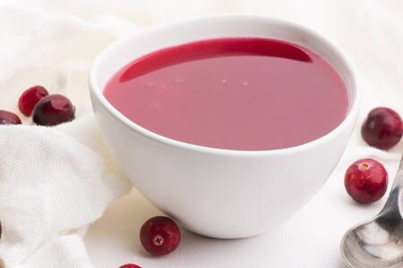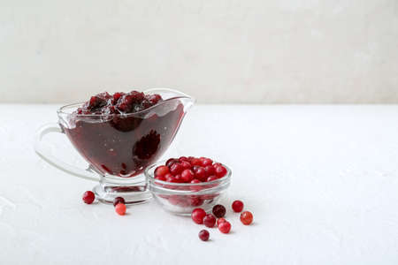 Fresh Lingonberry sauce in a gravy boat on a white wooden background.