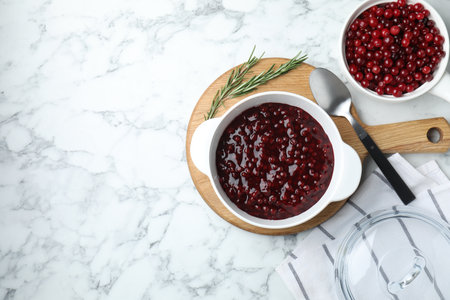Fresh cranberry sauce in bowl served on white marble table, flat lay. Space for text