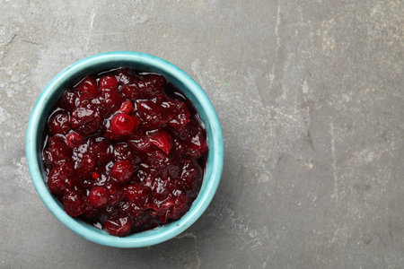 Tasty cranberry sauce in bowl on gray table, top view. Space for text
