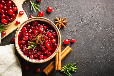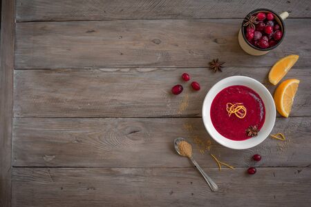 Cranberry orange sauce. Traditional home cooking christmas, thanksgiving recipe for cozy classic food. Cooking ingredients cinnamon, brown sugar, orange juice, red berries. Top view.