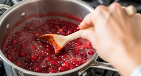 A person's hand uses a wooden spoon to stir a pot of bubbling, hot cranberry sauce. The vibrant red sauce, full of whole cranberries, is simmering in a stainless steel saucepan on a stove.