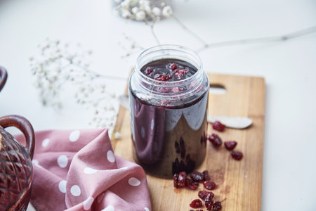 Healthy fermented sustainable honey product with cranberry. Food preservative. Delicious recipe concept. Anti-viral food. Rustic, home concept