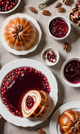 Thanksgiving Cranberry Jelly, Pecan Rolls, And A Roasted Turke. Generative AI