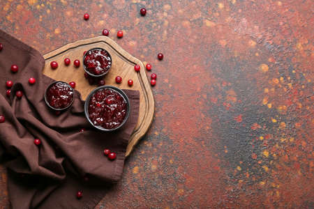 Cranberry jam in glass jars. Cranberries are scattered nearby. On wooden boards with a beautiful texture.