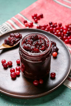 Fresh homemade cranberry jam in a metal bowl. Selective focus.
