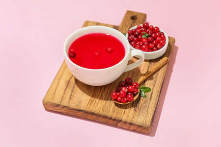 Wooden board with cup of tasty lingonberry tea and berries on color background