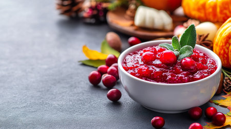 vibrant bowl of cranberry sauce garnished with fresh sage sits on table, surrounded by autumn leaves and pumpkins, creating festive and cozy atmosphere.
