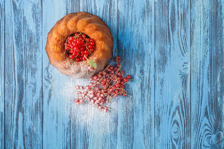 Fresh delicious cake with berries on table, close-up. Homemade cottage cheese biscuit cake with red currants. Summer pie with fruit
