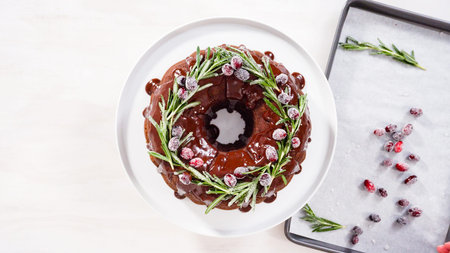 Step by step. Flat lay. Chocolate bundt cake with chocolate frosting decorated with fresh cranberries and rosemary covered in a white sugar.