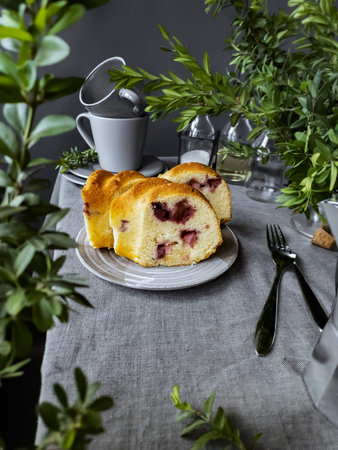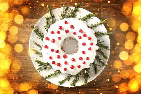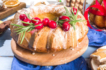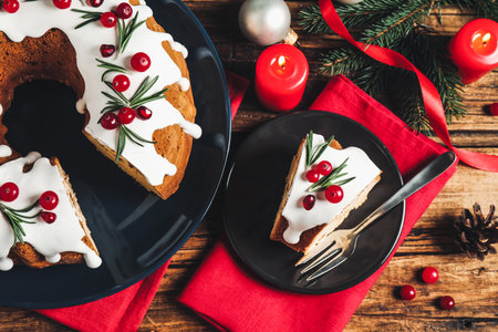 Christmas festive pound cake decorated with cranberries, view from above