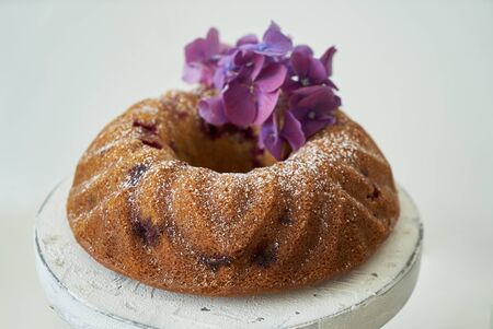 Christmas homebaked dark chocolate bundt cake decorated with powdered sugar and fresh berries, front view