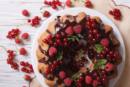 Homemade berry sponge cake with chocolate icing on a plate closeup. horizontal view from above