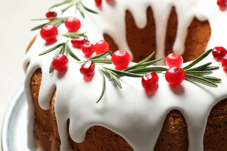 Traditional Christmas cake decorated with glaze, pomegranate seeds, cranberries and rosemary on table, closeup