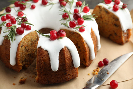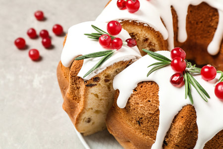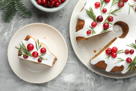 Delicious cut Christmas cake with icing, cranberries and rosemary on gray textured table, closeup