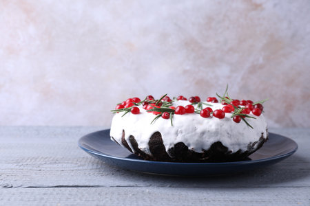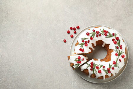 Tasty Christmas cake with cranberries and rosemary on gray wooden table against light background. Space for text