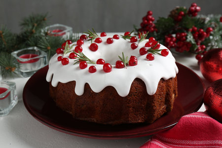 Traditional classic Christmas cake and decor on white table, closeup