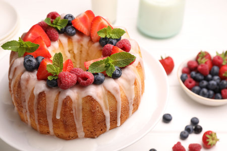 Delicious bundt cake with berries, glaze and mint on white table, closeup