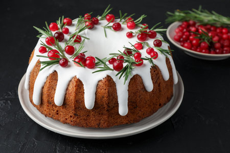 Delicious Christmas cake with cranberry on dark background