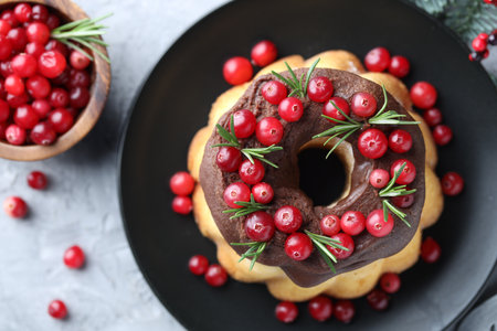 Delicious Christmas cake with chocolate glaze, cranberries and rosemary on gray textured table, flat lay
