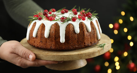 Woman holding delicious Christmas cake with icing, cranberries and rosemary against black background with blurred lights, closeup. Bokeh effect