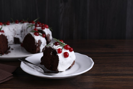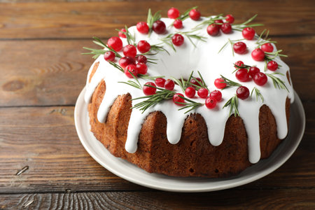 Tasty Christmas cake with cranberries and rosemary served on wooden table, closeup. Space for text