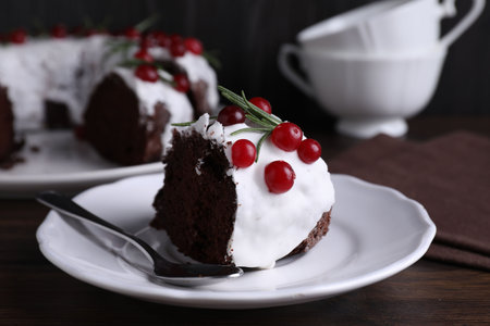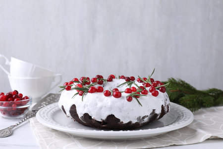 Traditional homemade Christmas cake decorated cranberry and rosemary on plate. Close up. Holiday food.