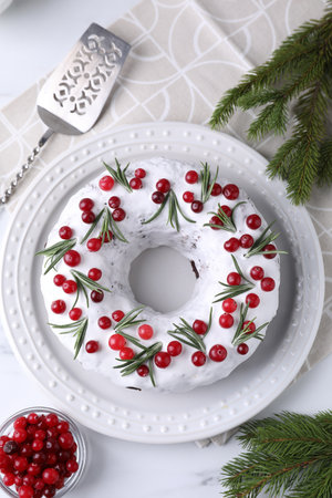 Tasty Christmas cake with icing, cranberries and rosemary on white wooden table, top view