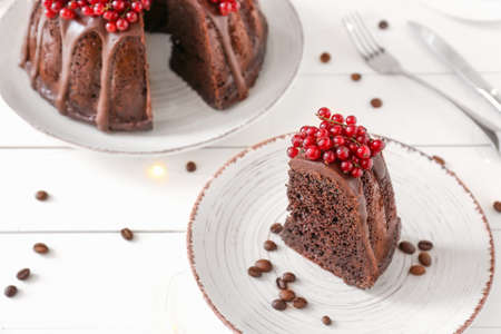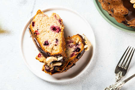 Piece of Bundt cake with nuts, berries and chocolate on white background. Top view of cake. Festive cake. New year cake with chocolate. Christmas dessert.