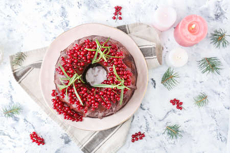 Christmas chocolate bund cake. Traditional Christmas fruit cake with white glaze, cranberries and rosemary on white stand with Christmas decoration. Winter baking at Xmas or New Year. copyspace.