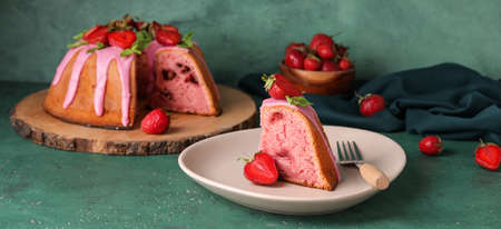Plate with piece of tasty strawberry cake on green background