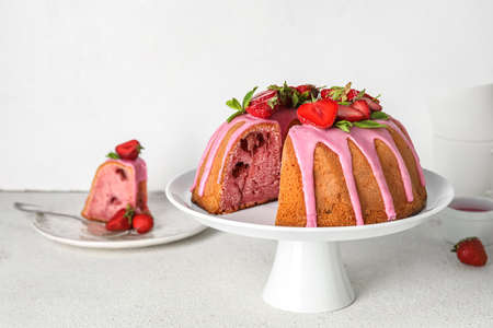 Dessert stand with delicious strawberry cake on light background