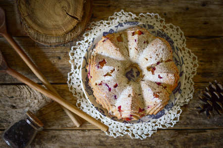 Homemade Christmas pastries, sweet cheesecake pie with powdered sugar, cranberries and rosemary. Christmas and New Years festive baking background