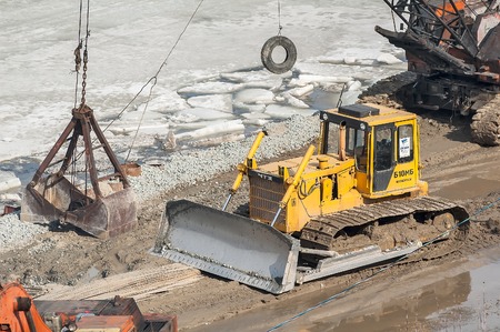 Tyumen, Russia - March 29, 2008: Construction of pedestrian quay on Tura river. Digger, heavy duty construction equipment parked at work site