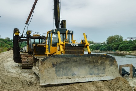 Tyumen, Russia - September 15, 2007: Construction of pedestrian quay on Tura river. Digger, heavy duty construction equipment parked at work site