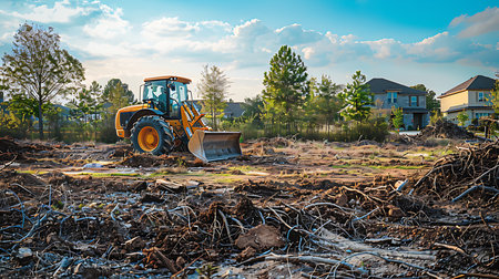 heavy duty earth moving bulldozer doing landscaping works and moving soil