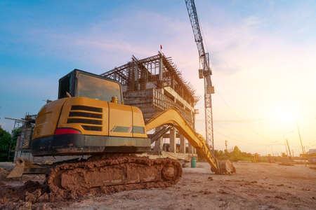 Excavator in construction site on sunset sky background. unfinished construction site.