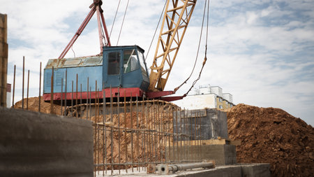 Construction machine (excavator) on the background construction site, industrial image. Moscow, Russia