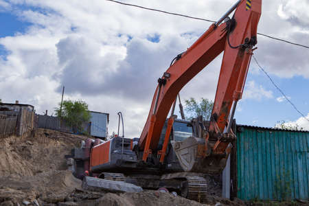 Orange tractor digs pit for construction of multi-storey building in residential area. Minsk, Belarus - 09.06.21