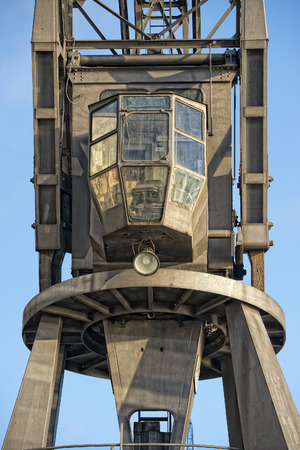 Russia, Saint Petersburg, may 30, 2020: Close-up of a fragment of a port sea crane against the blue sky