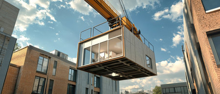 A crane lifts a modular house into place at a sleek apartment complex on a bright afternoon, highlighting innovative design.